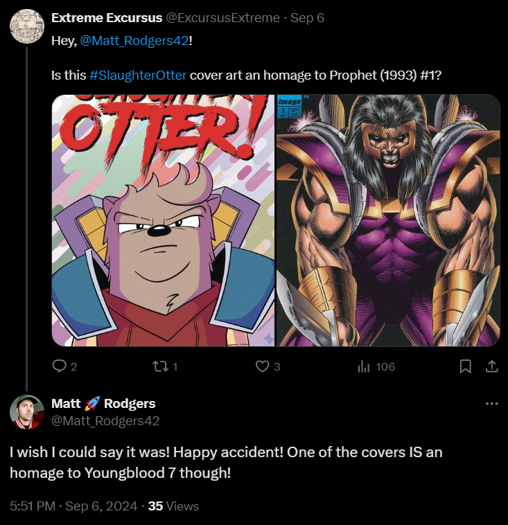 I asked Matt Rodgers on Twitter/X about this possible Prophet #1 homage. He said it was a “happy accident!”