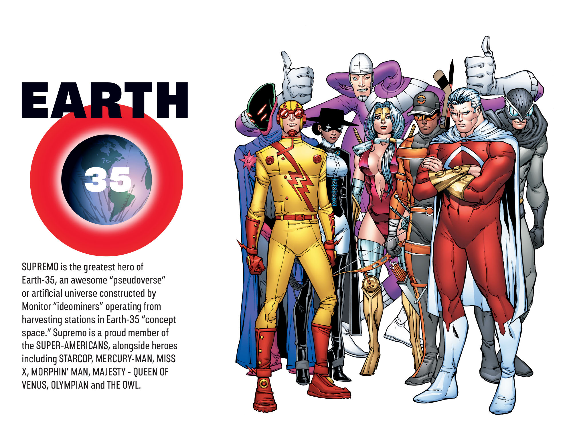 Earth-35 is an analogue for the characters of Rob Liefeld’s Awesome Comics, written most notably by Alan Moore, who in his run on Supreme introduced “idea space”, similar to the “concept space” which formed Earth-35. Its team the Super-Americans is based on Awesome’s Allied Supermen of America. Majesty is an homage to Glory of Awesome Comics, created by Rob Liefeld and reinvented by Alan Moore in his run on Supreme, herself a pastiche of Wonder Woman. Mercury-Man is an homage to Doc Rocket of Awesome Comics, created by Alan Moore in his run on Supreme, himself a pastiche of Flash. Miss X is an homage to Alley Cat of Awesome Comics, created by Alan Moore in his run on Supreme, herself a pastiche of Black Canary and Catwoman. Morphin’ Man is an homage to Polyman of Awesome Comics, created by Alan Moore in his run on Supreme, himself a pastiche of Plastic Man. Olympian is an homage to Fisherman of Awesome Comics, created by Alan Moore in his run on Supreme, himself a pastiche of Green Arrow. The Owl is an homage to Professor Night of Awesome Comics, created by Alan Moore in his run on Supreme, himself a pastiche of Batman. The Owl is also confirmed by creator Grant Morrison as the Batman-analogue seen in Batman #256, making him additionally his universe’s version of Bruce Wayne. Starcop is an homage to Spacehunter of Awesome Comics, created by Alan Moore in his run on Supreme, himself a pastiche of Martian Manhunter. Supremo is an homage to Supreme of Awesome Comics, created by Rob Liefeld and influentially reinvented by Alan Moore, himself a pastiche of Superman.