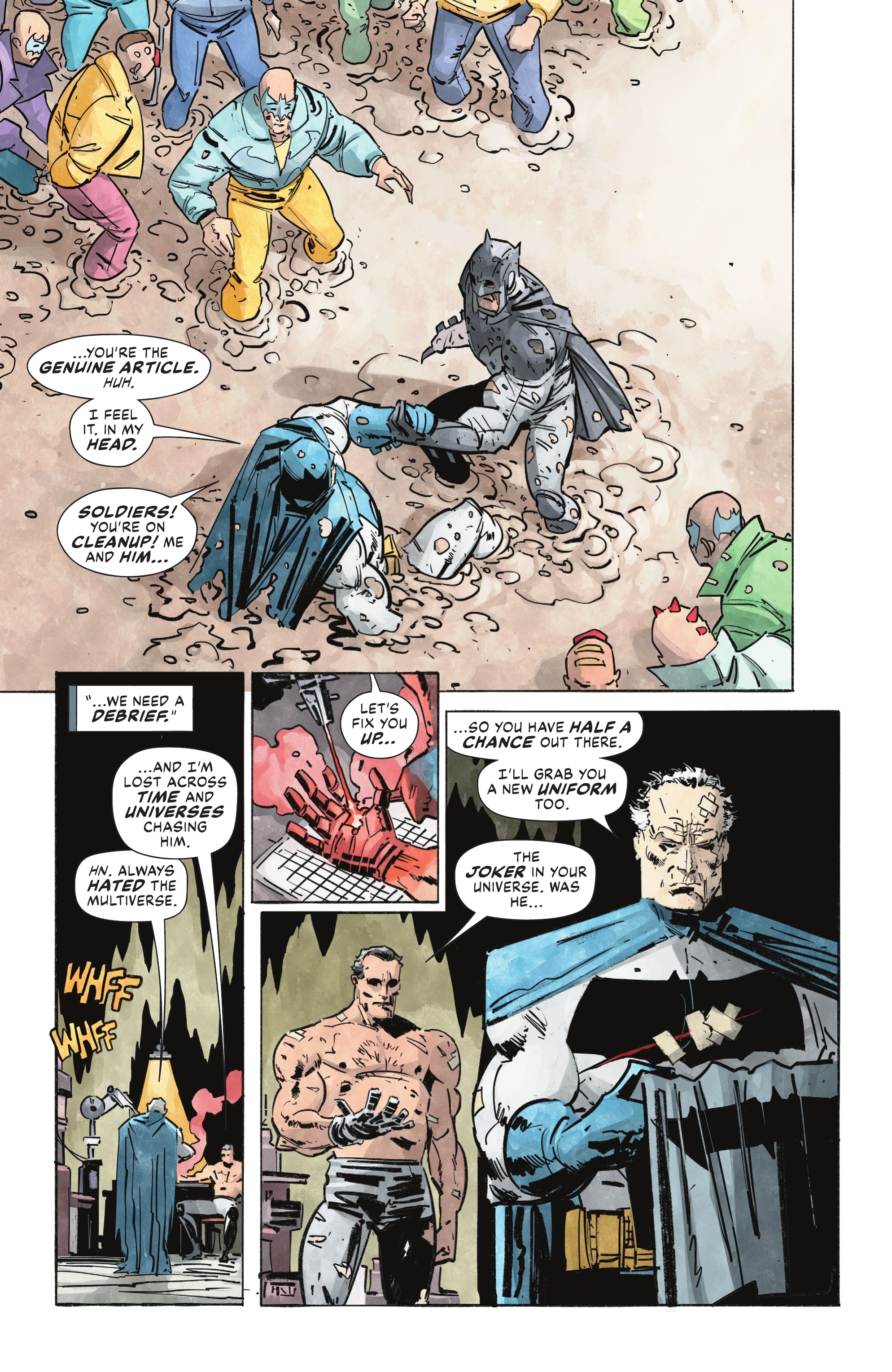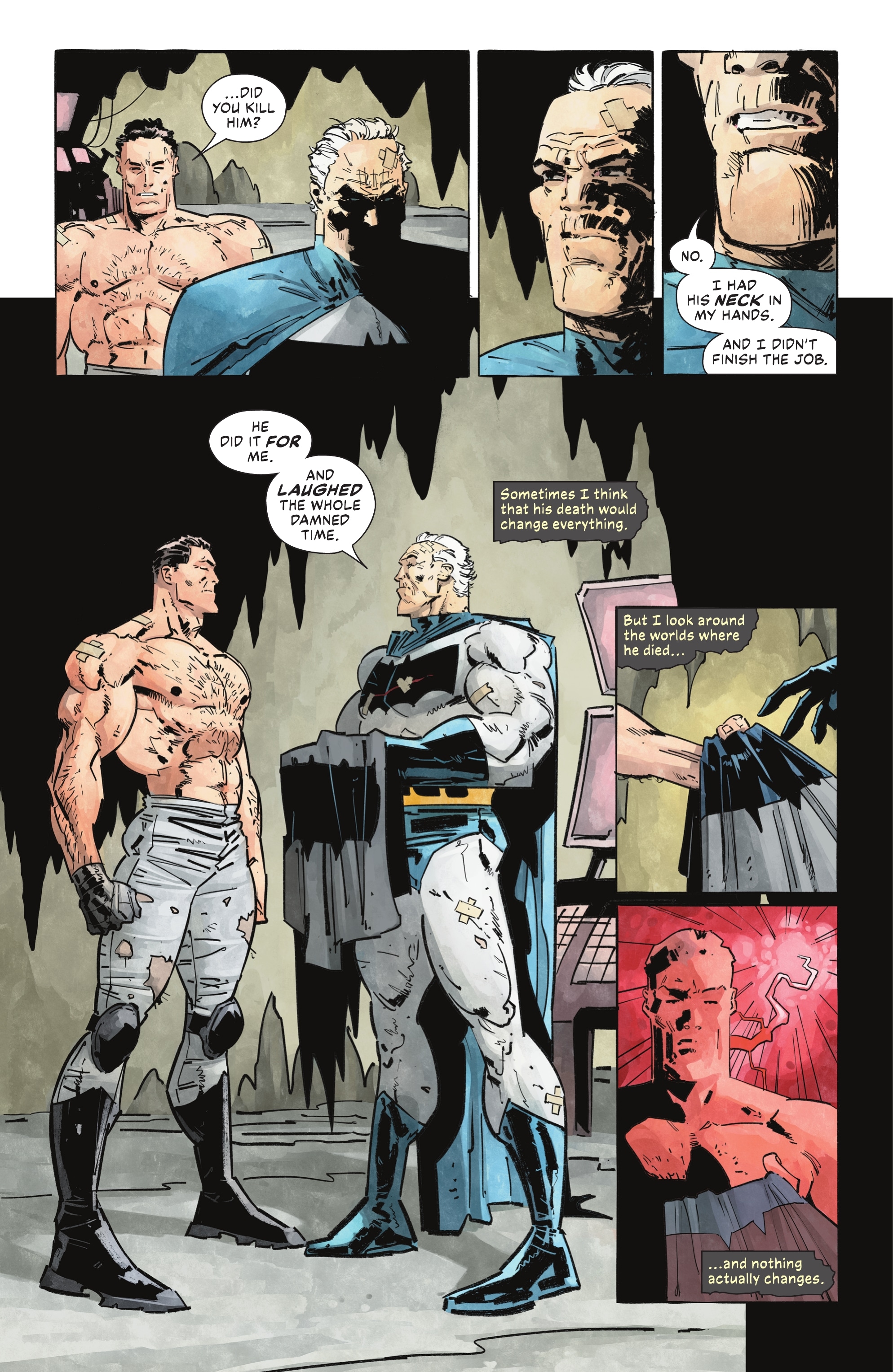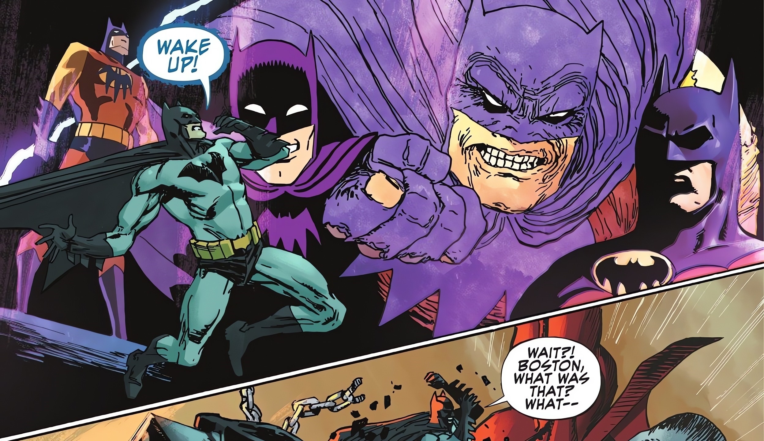 - Jumping through the “multiverse”, Batman encounters the world of ‘The Dark Knight Returns’ for 3 pages.