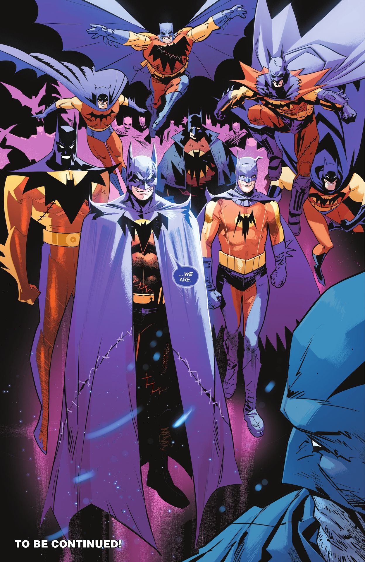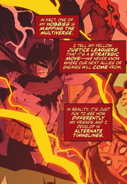 - This is a time-based story and the multiple Batmen that appear are from different times, not different dimensions. (This is not ‘Batmen of the Multiverse’.)