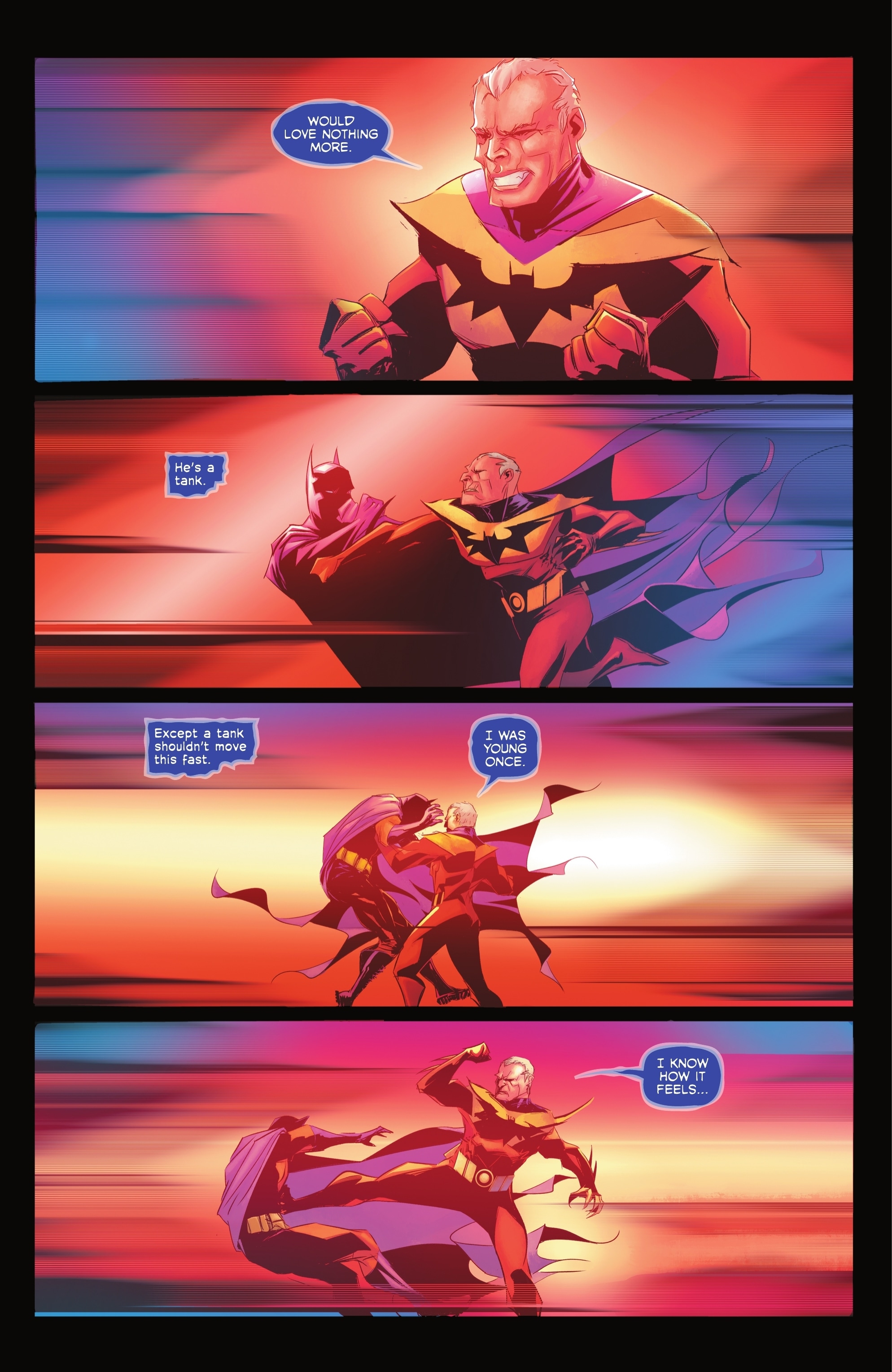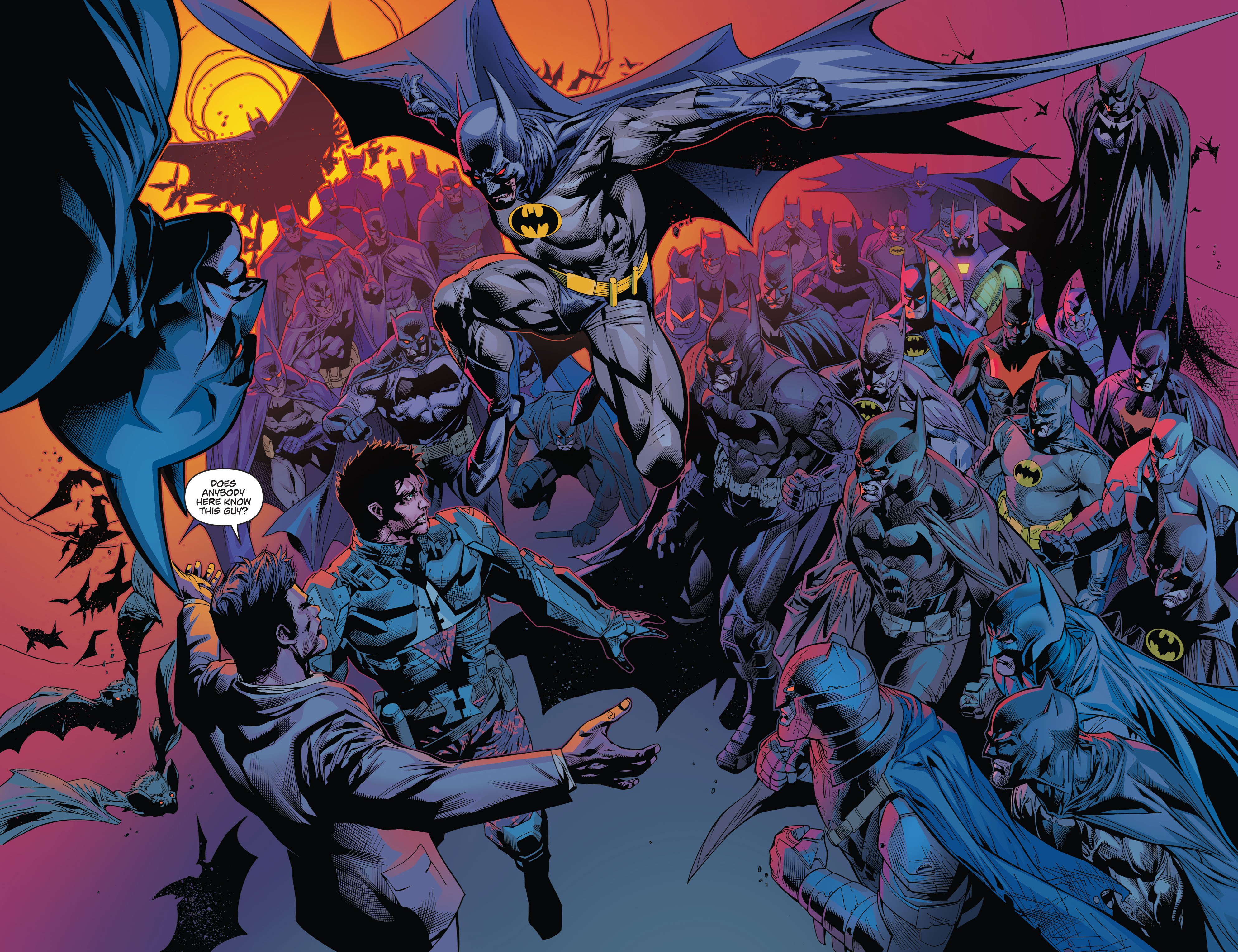 - A 2-page splash showing a hallucination of many Batman variants includes Batman from ‘The Dark Knight Returns’.