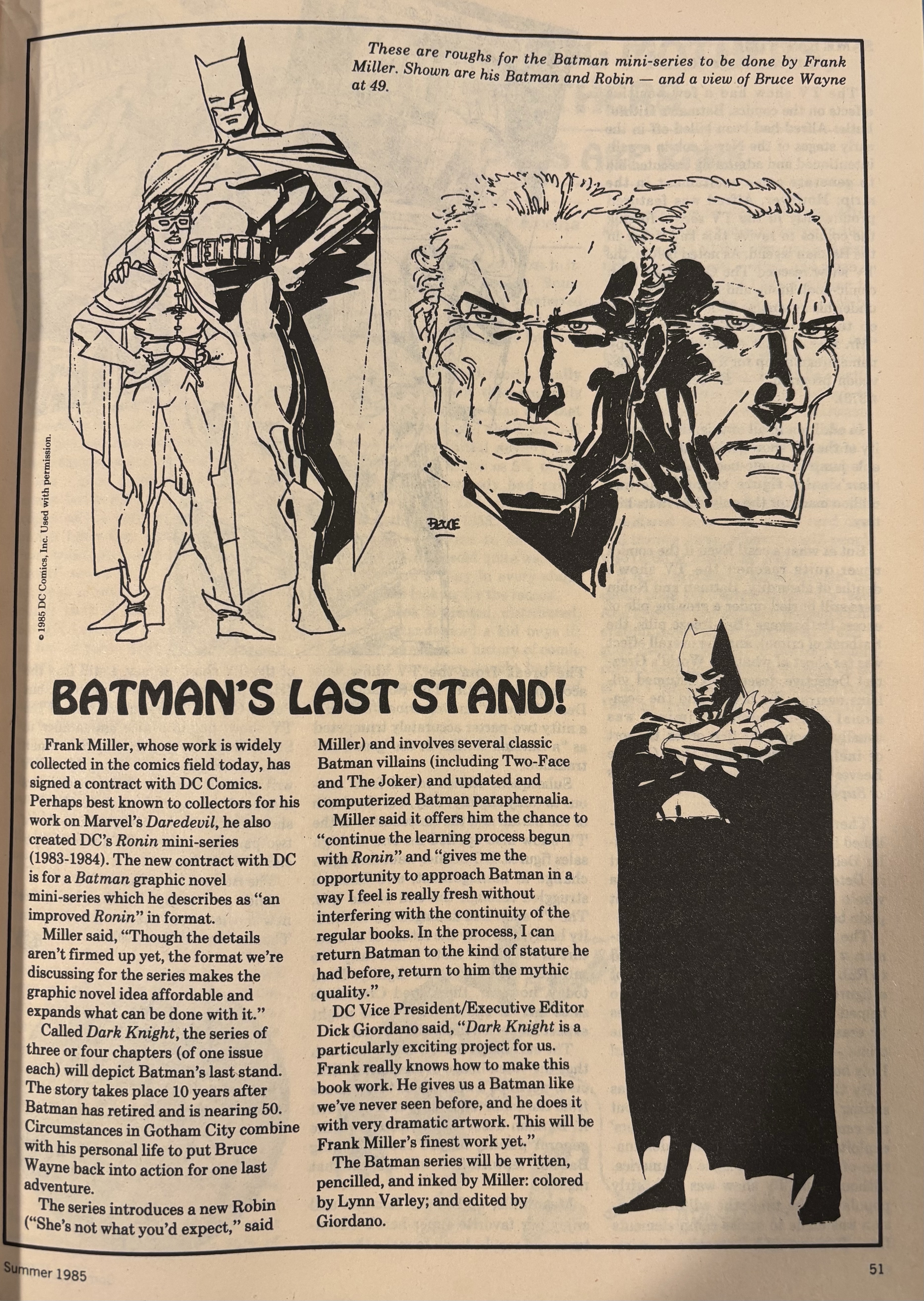 - Batman and Robin (Carrie Kelley) appear in an article on page 51 almost a year before Batman: The Dark Returns is released.
