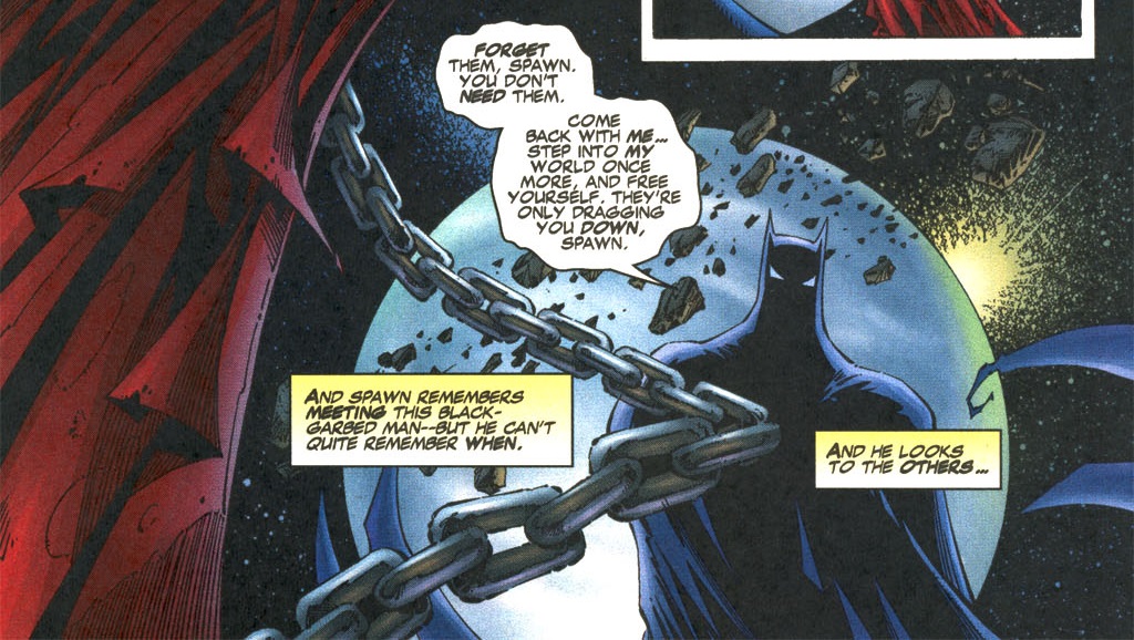 - Spawn’s temptation comes in the form of Batman, who references their previous crossover. The art style is obviously meant to evoke the way Todd McFarlane drew Batman. This further solidifies the idea that ‘Spawn-Batman (1994)’ took place in Batman’s world, not Spawn’s.