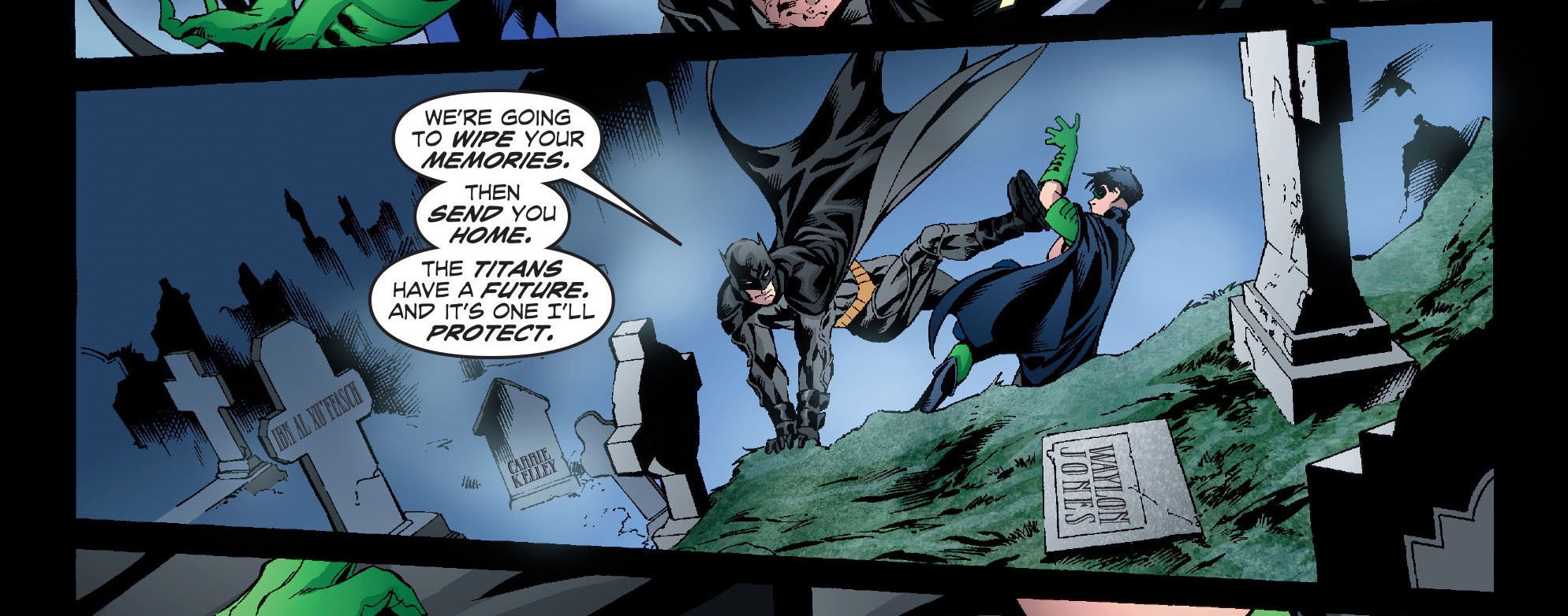 - This issue’s story is “Part 2” of a tale set “10 years” ahead of the then “current” continuity. During a fight in a graveyard full of stones for Batman friends and foes, a stone for Carrie Kelley can be seen.