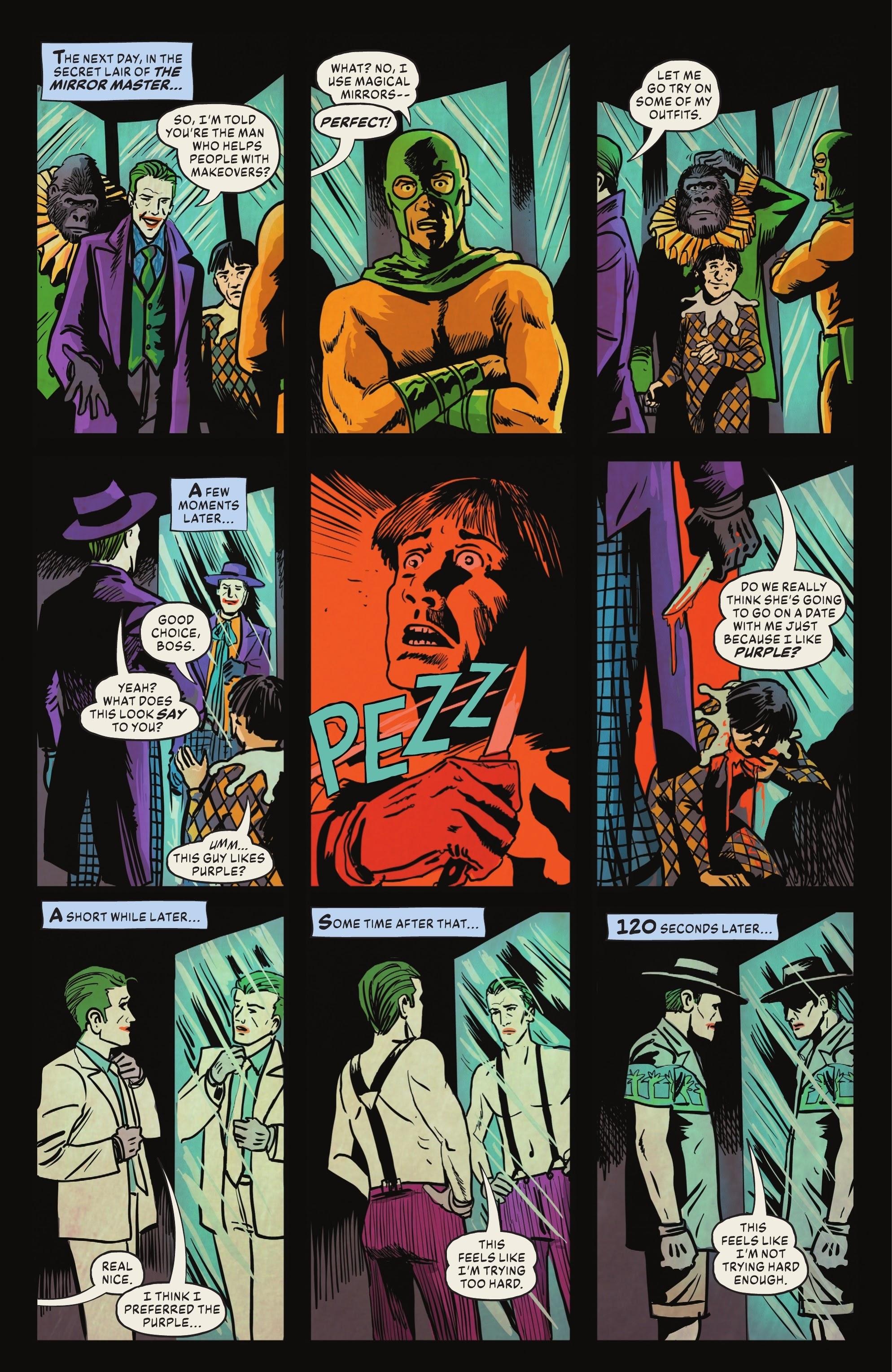 - Joker tries different looks to find the best one for his upcoming date. These looks reference famous iterations of the Joker from DC history. One of these looks is Joker in his white suit from ‘The Dark Knight Returns (1986)’.