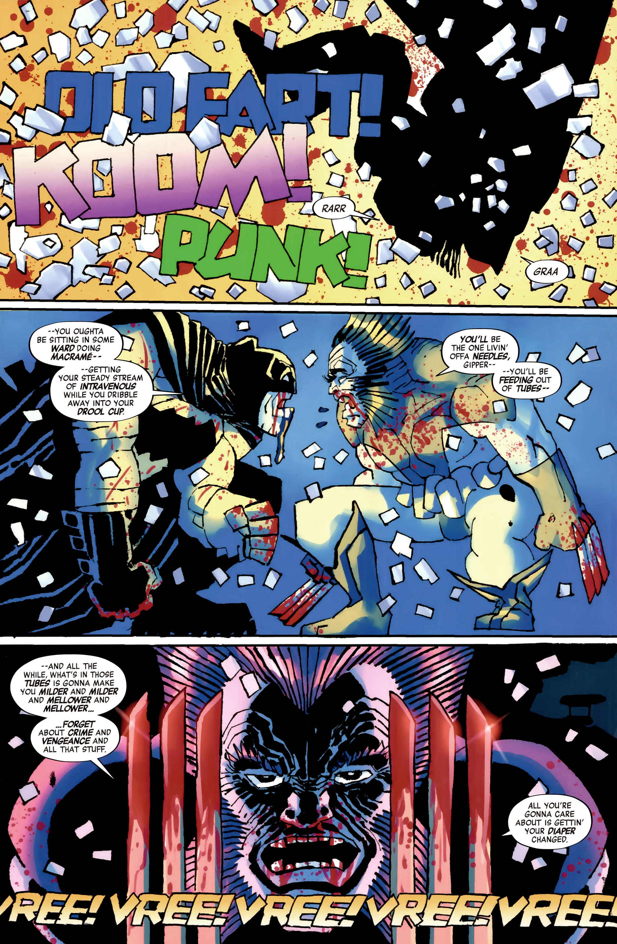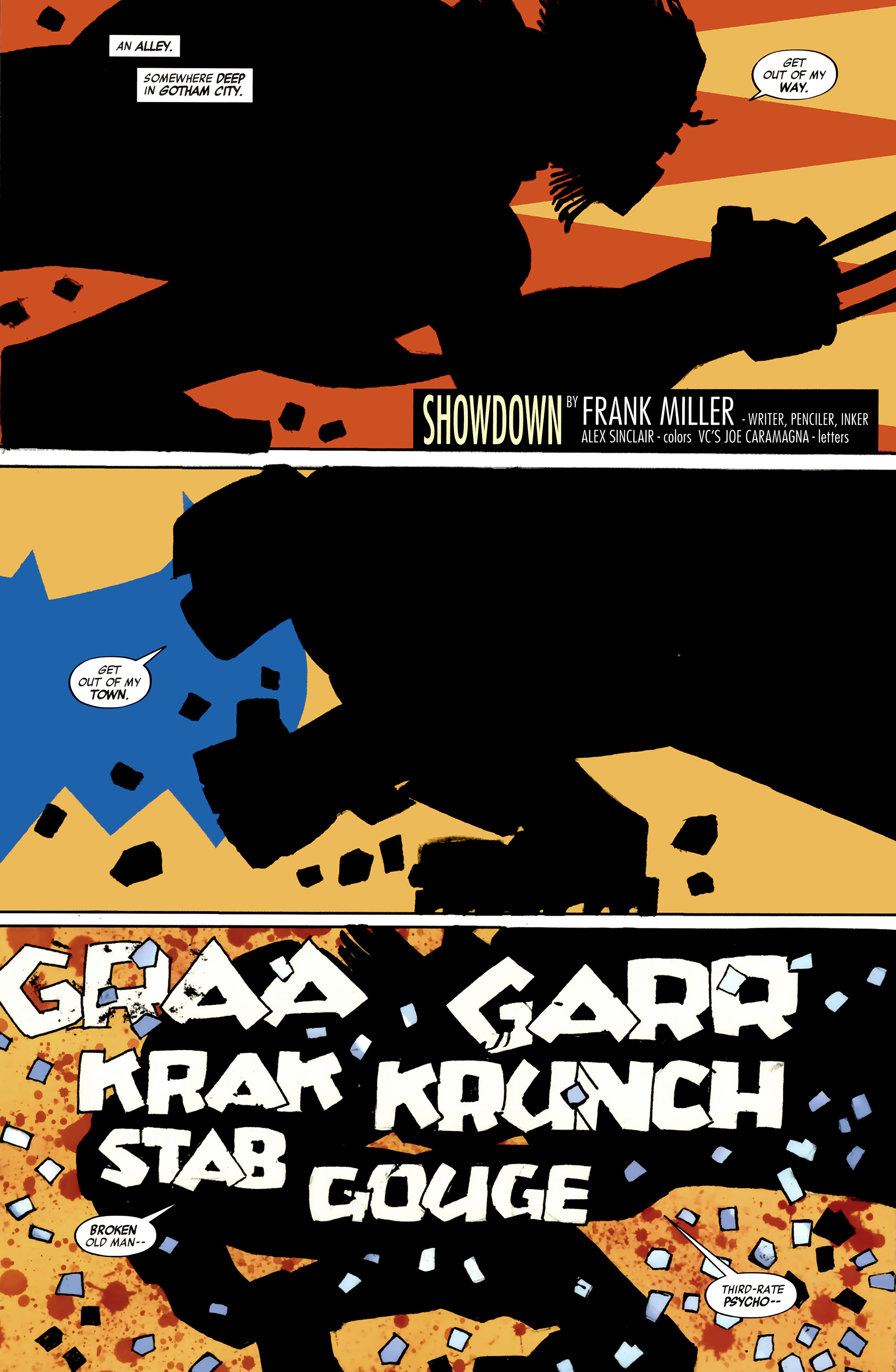 - This book contains a 3 page story, “Showdown”, written and drawn by Frank Miller where the TDK Batman fights Old Man Logan.